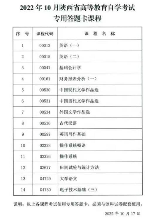 2022年10月陕西自考要用专用答题卡的课程是英语(一)、英语(二)、基础会计学、财务报表分析(一)、中国现代文学作品选、中国当代文学作品选、外国文学作品选、古代汉语、英语写作基础、操作系统概论、操作系统、田间试验与统计方法、大学语文、电子技术基础(三)。