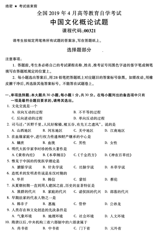 全国2019年4月自考00321中国文化概论试题
