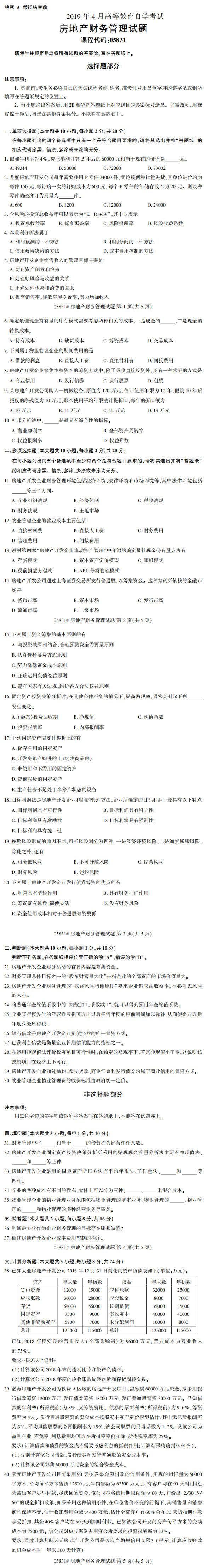 全国2019年4月自考05831房地产财务管理试题