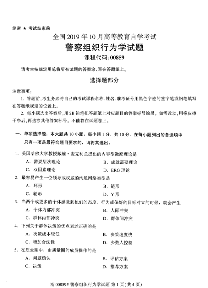 全国2019年10月自考00859警察组织行为学试题