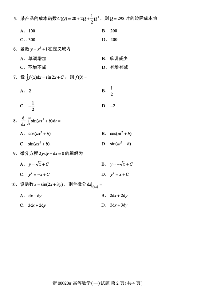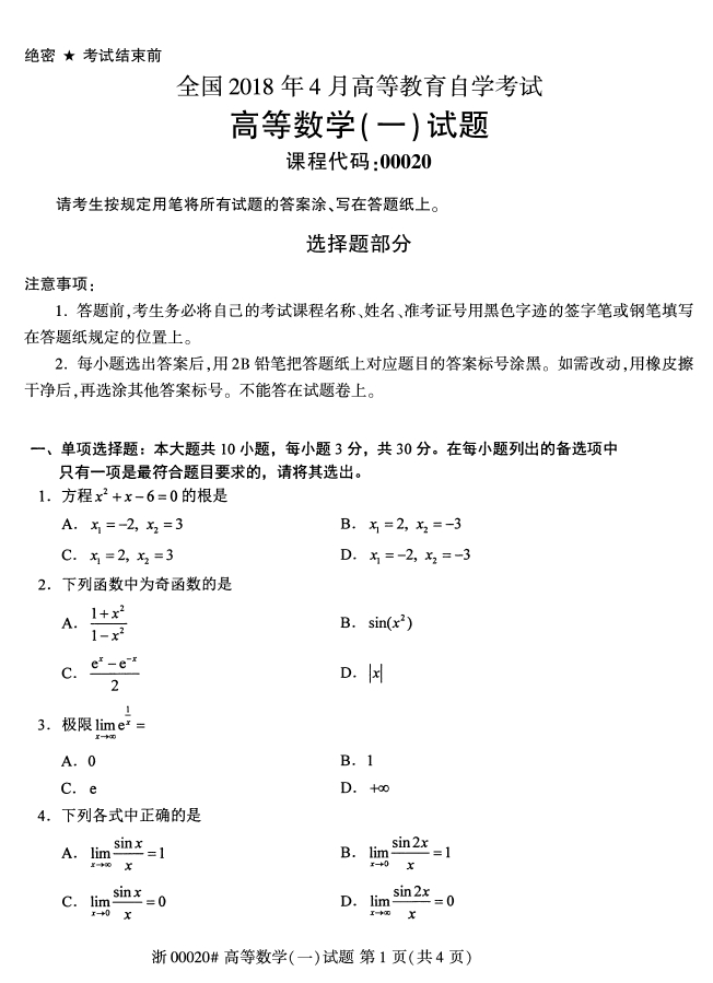 全国2018年4月高等教育自学考试高等数学(一)试题